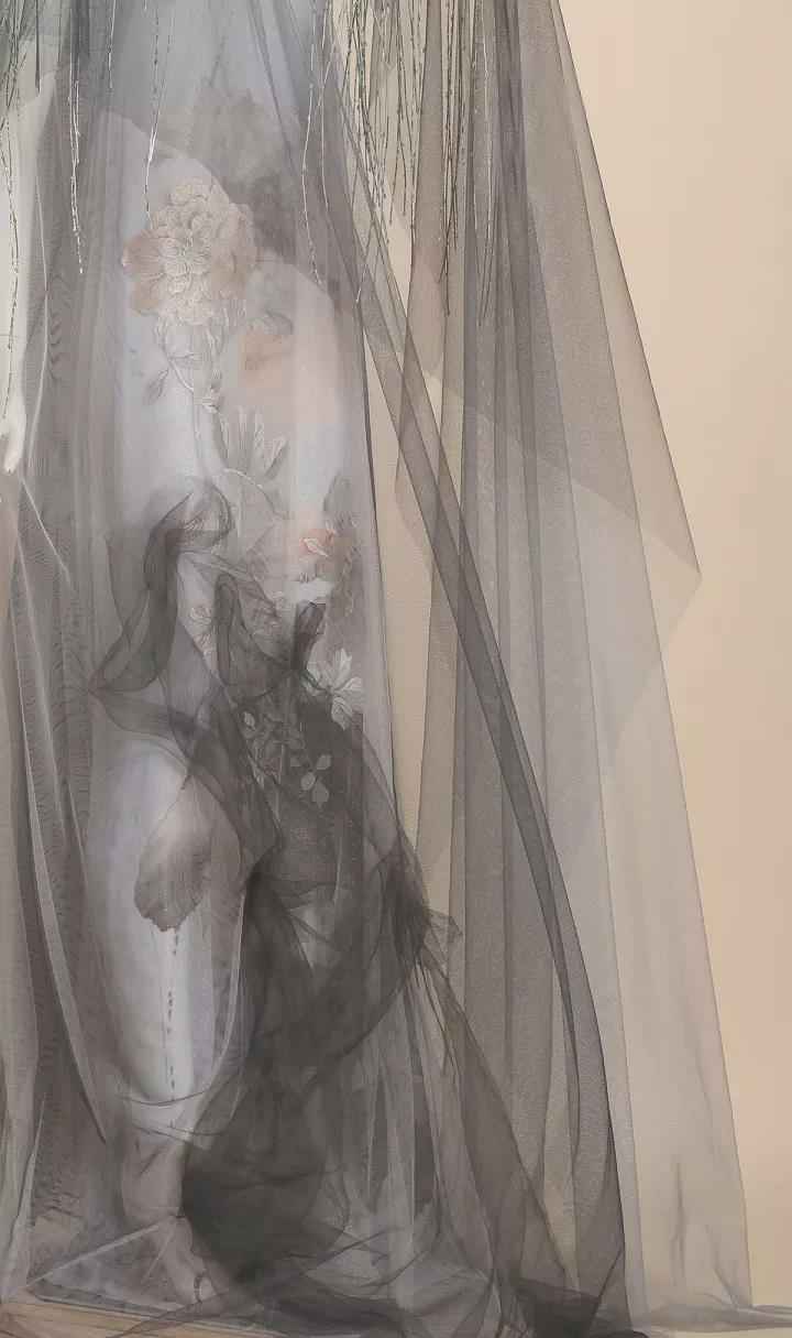 模特身着轻纱叠透,头带斗箩杨柳,由远处缓缓走来,墨荷摇曳,幻雅生姿,逸风清扬,翩然于飞。完美的展现东方美的想像空间和灵动性。